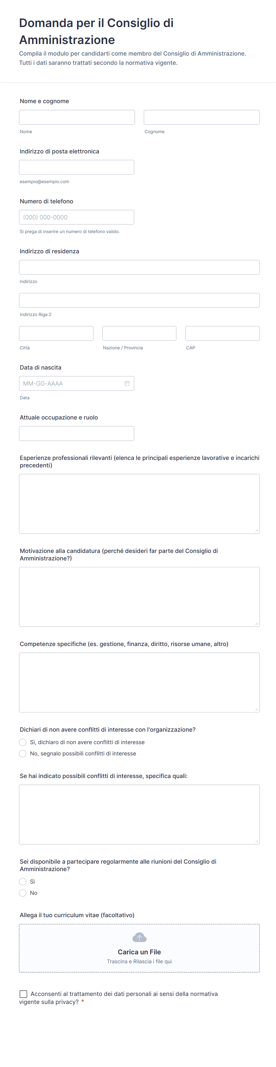 I moduli di domanda sono strumenti essenziali utilizzati per raccogliere informazioni da individui o organizzazioni che desiderano presentare domanda per qualcosa, che si tratti di un lavoro, una borsa di studio, un'iscrizione, un prestito o la partecipazione a un evento o programma. Questi moduli standardizzano il processo di ammissione, garantendo che tutti i candidati forniscano i dettagli necessari per una valutazione equa ed efficiente. I moduli di domanda possono essere personalizzati per un'ampia gamma di scenari, dalle opportunità di lavoro e volontariato alle ammissioni scolastiche, alle richieste di sovvenzioni, i contratti di locazione e altro ancora. La loro versatilità li rende indispensabili per aziende, istituti scolastici, organizzazioni non profit ed enti governativi.
