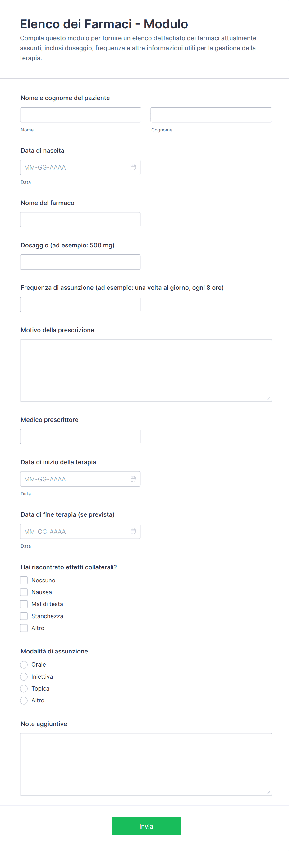 • I moduli di accettazione sanitaria possono richiedere campi per la storia clinica, le allergie e l'assicurazione.