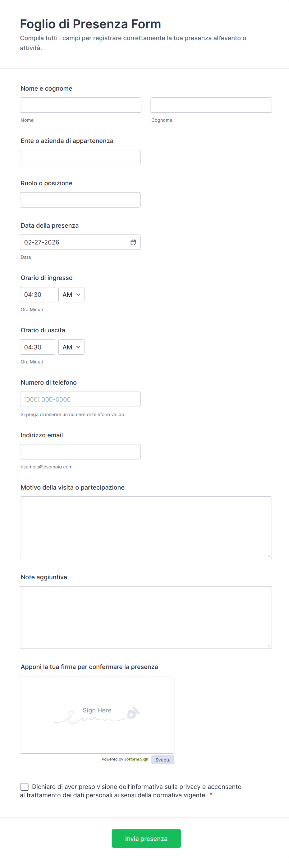 Un modulo di presenza è uno strumento digitale o cartaceo utilizzato per registrare la presenza o l'assenza di individui a un evento, lezione, riunione o luogo di lavoro.