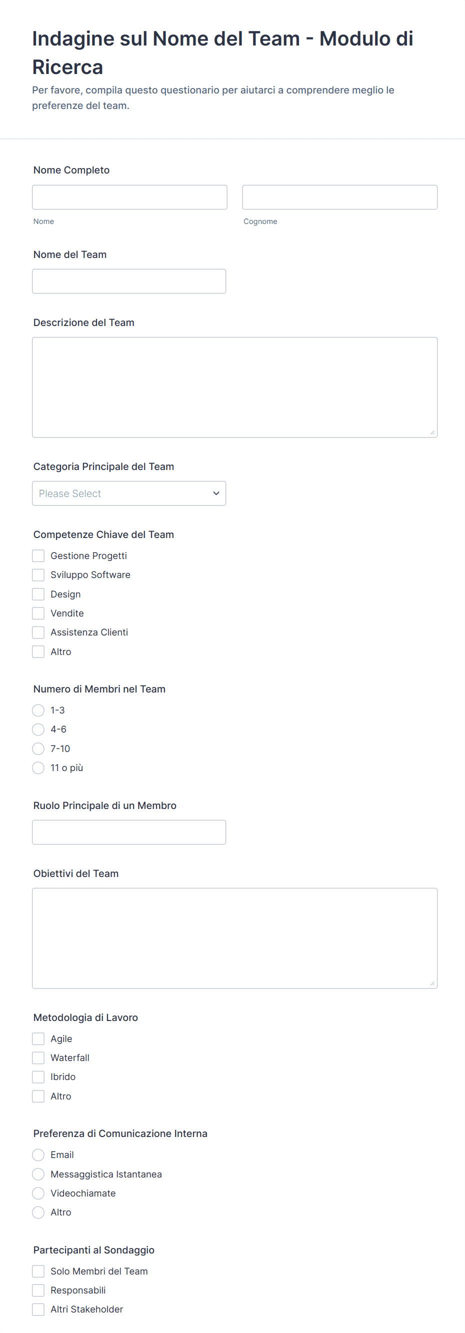 Raccogli proposte e preferenze per scegliere o rinominare un gruppo con il Modulo FORM per Indagine sul Nome del Team di Jotform, ideale per aziende e associazioni che vogliono coinvolgere i partecipanti nella decisione.