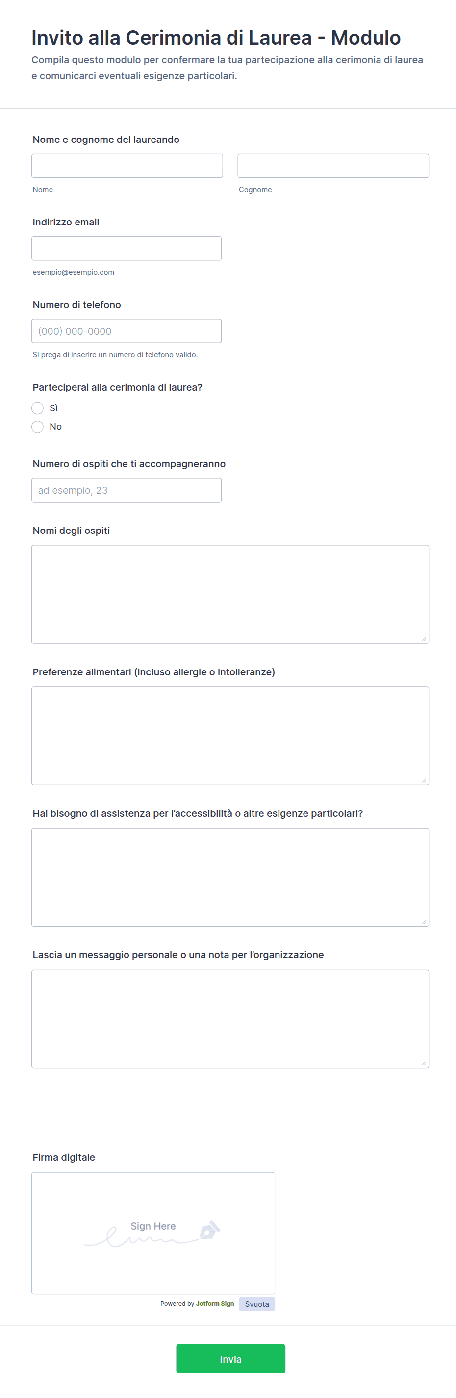 Il Modulo di invito alla cerimonia di laurea facilita le conferme di partecipazione e la gestione degli ospiti per laureandi e organizzatori, migliorando la raccolta dati e l’invio del modulo online con Jotform.