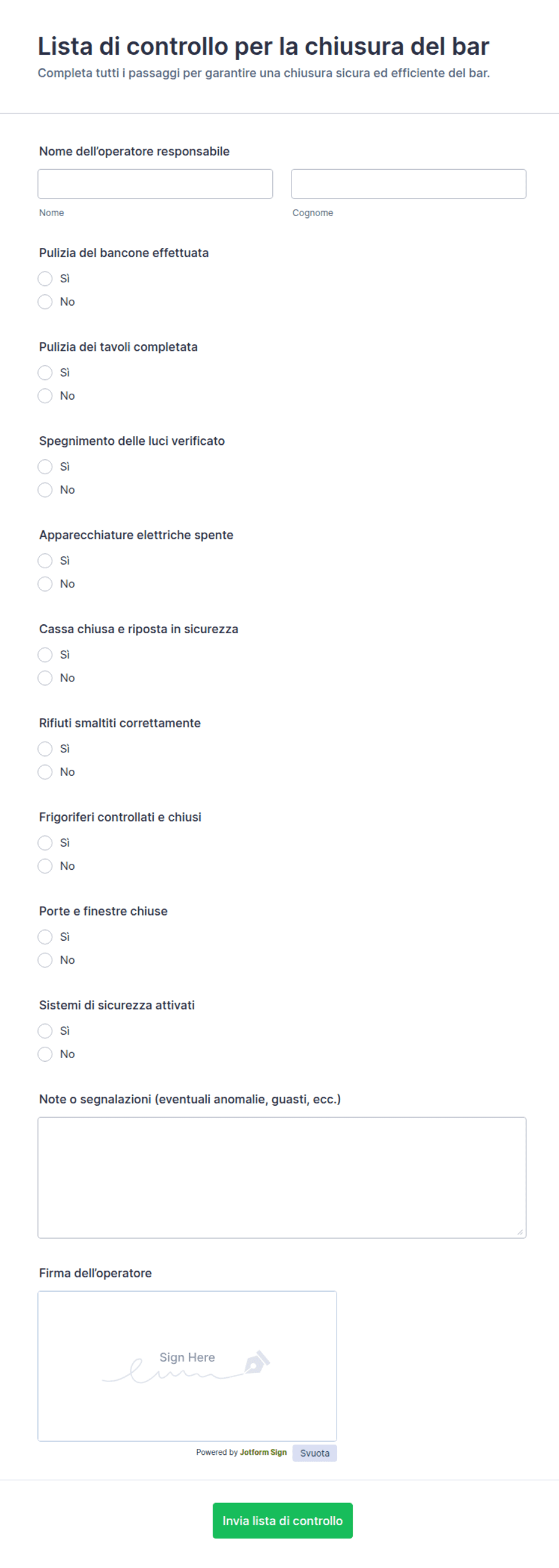 Gestisci le verifiche di fine turno con la Checklist di revisione per la chiusura del ristorante Form, utile a ristoranti e bar per standardizzare la chiusura, registrare controlli e note, e migliorare l’organizzazione del team.