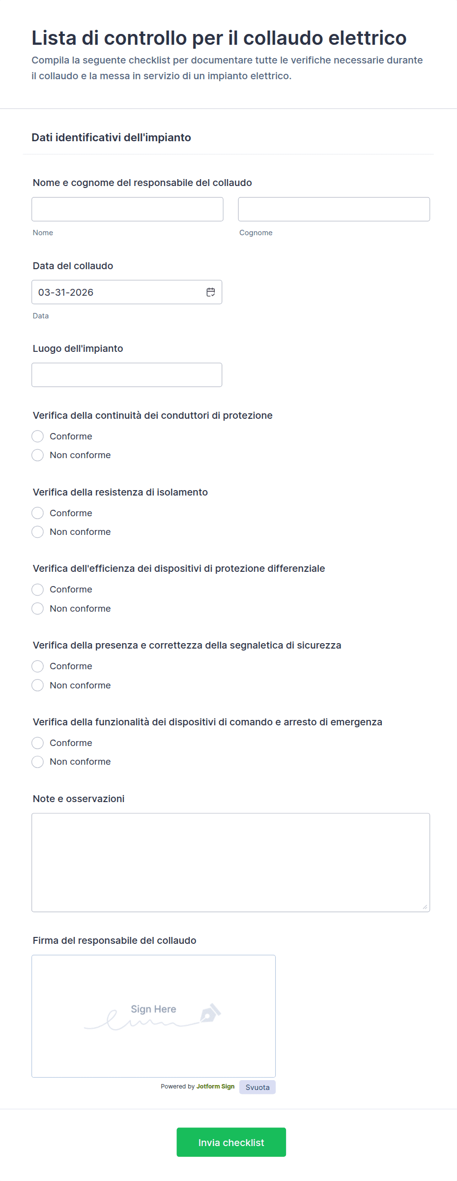 Registra controlli e risultati dei collaudi degli impianti con la Lista di controllo per il collaudo elettrico Modulo di Jotform, utile a tecnici e aziende per la raccolta dati e la gestione di ogni invio del modulo.