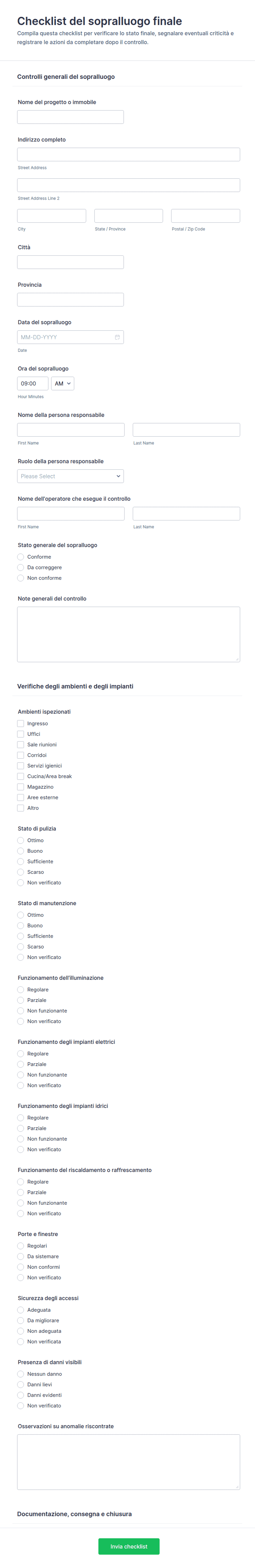 - Checklist per i criteri di ispezione (es.: attrezzature di sicurezza, condizioni della proprietà)