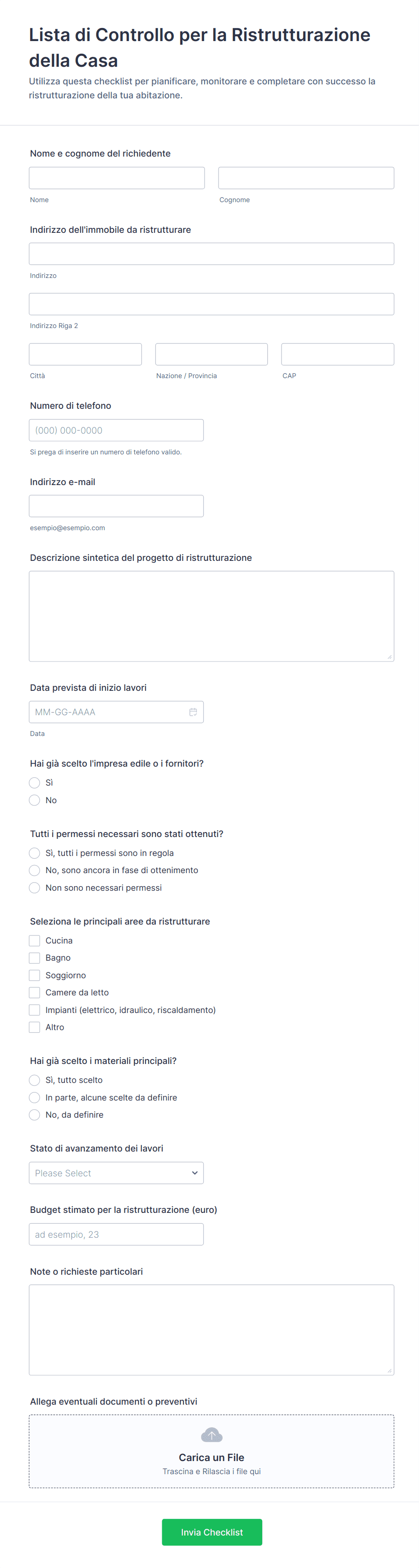 - Per liste di controllo più complesse, aggiungi menù a tendina, campi di caricamento file (per allegare prove o report) o campi firma (per la verifica).