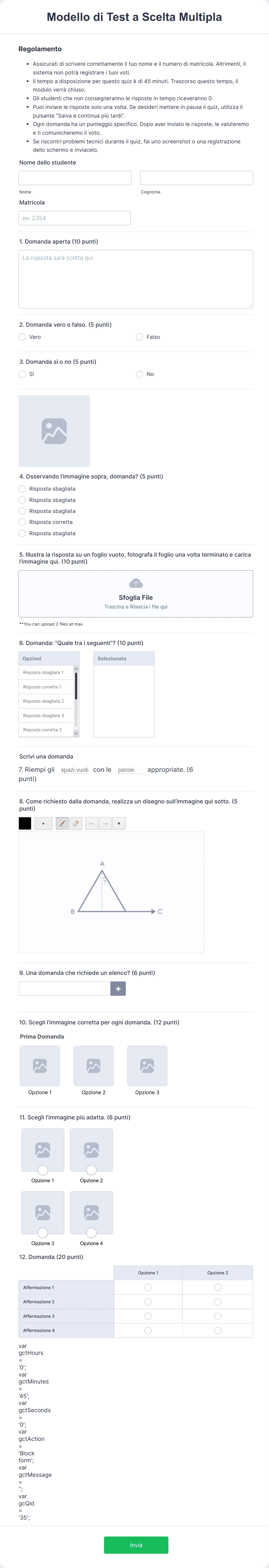 Crea e personalizza facilmente un Test a Scelta Multipla online. Raccogli risposte in tempo reale da ogni dispositivo e semplifica la correzione dei test con il nostro modello gratuito.