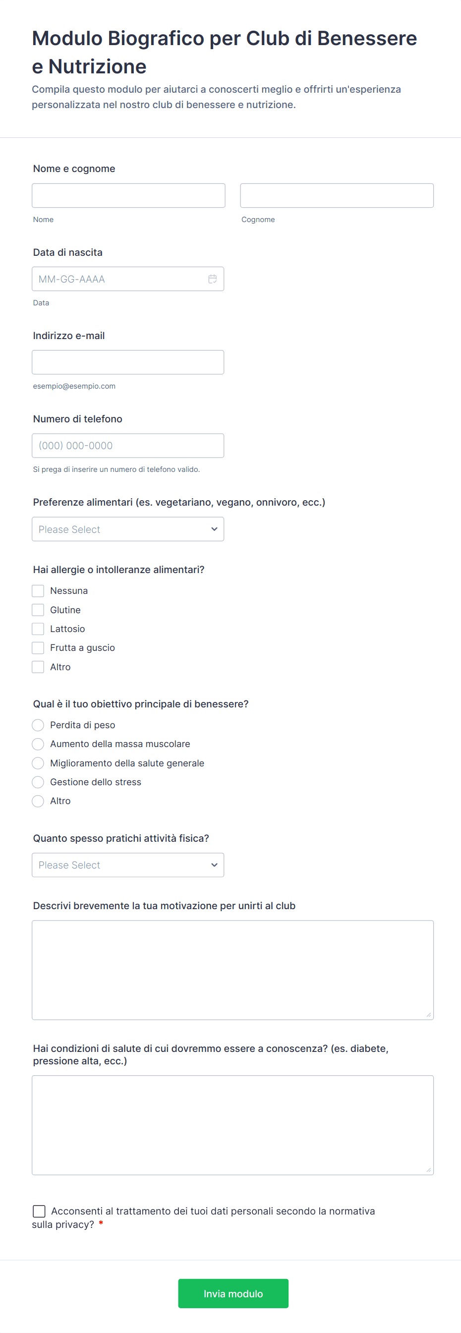 - I moduli di accettazione sanitaria possono richiedere campi per la storia clinica, le allergie e l'assicurazione.