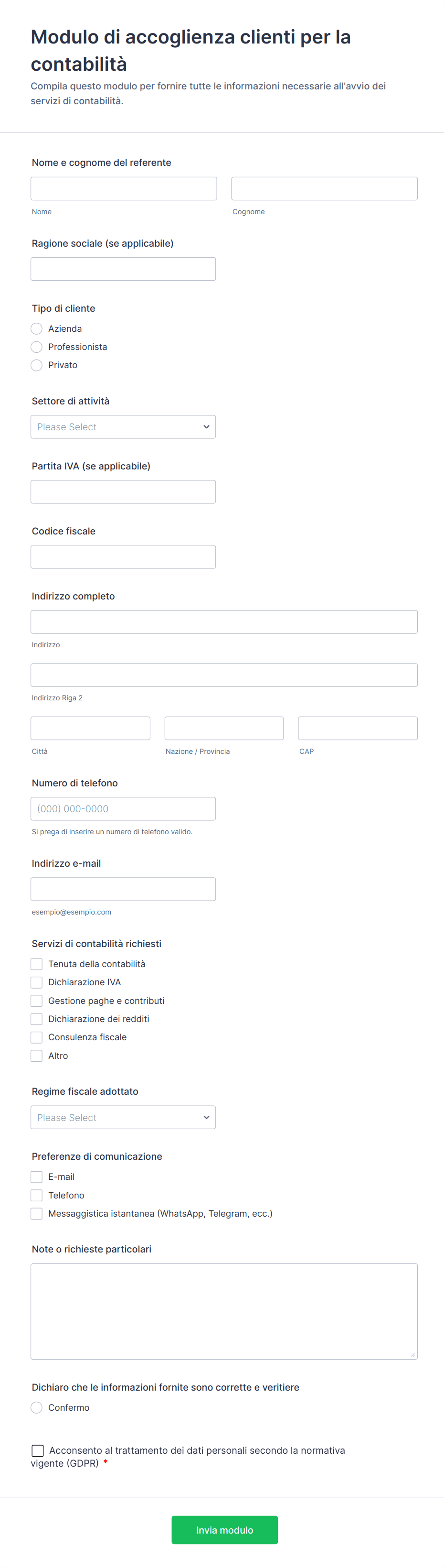 I moduli contabili semplificano la raccolta dati, riducono gli errori manuali e garantiscono che tutte le informazioni necessarie vengano raccolte in modo efficiente. Contribuiscono a mantenere la conformità, migliorare la comunicazione con i clienti e supportare un reporting finanziario accurato.
