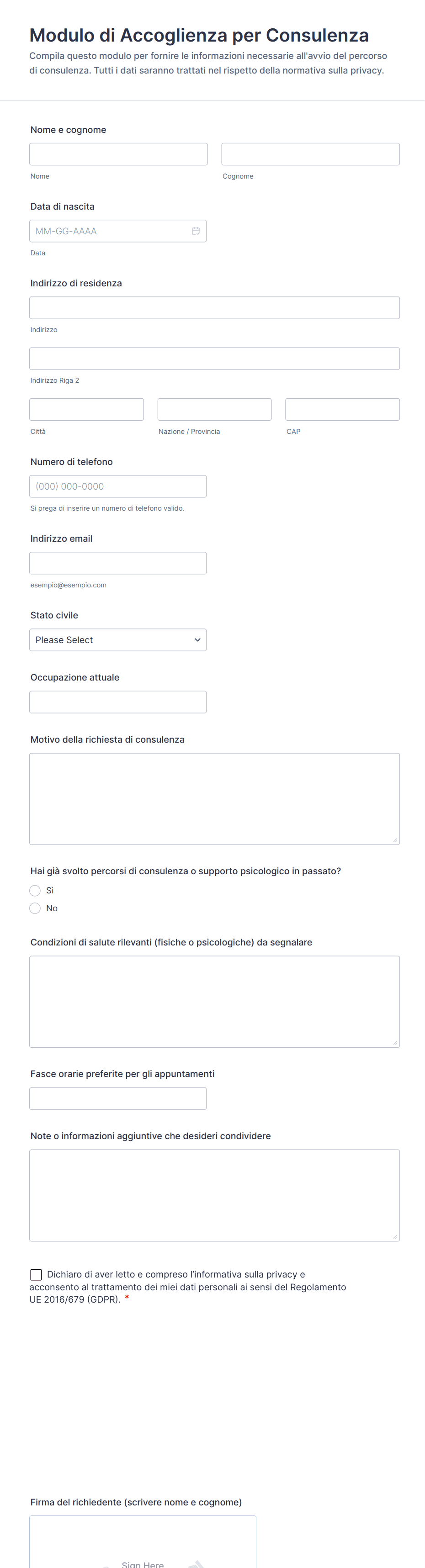 I moduli di acquisizione sono strumenti essenziali utilizzati per raccogliere informazioni preliminari da clienti, pazienti, clienti o partecipanti prima di fornire un servizio o iniziare un processo. Questi moduli semplificano il processo di onboarding raccogliendo dettagli rilevanti come informazioni di contatto, dati di background, preferenze e necessità specifiche. I moduli di acquisizione sono ampiamente utilizzati in vari settori, tra cui sanità (registrazione pazienti), legale (inserimento clienti), istruzione (registrazione studenti), risorse umane (inserimento dipendenti) e aziende basate sui servizi (consulenze clienti). Standardizzando il processo di raccolta delle informazioni, i moduli di inserimento aiutano le organizzazioni a garantire coerenza, migliorare l'efficienza e offrire esperienze personalizzate.