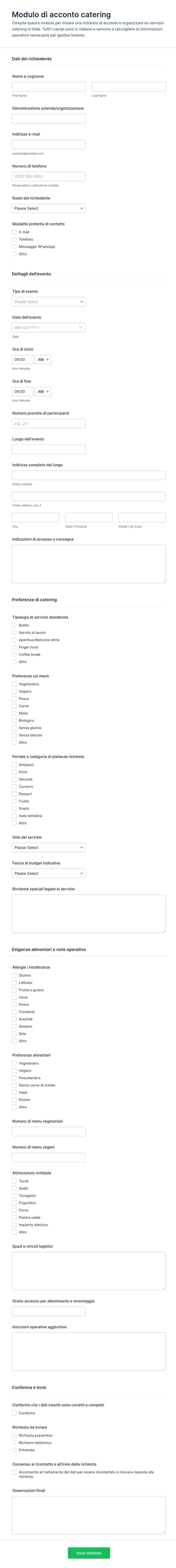 - Eventi Aziendali: potrebbero richiedere informazioni come dettagli dell'azienda, informazioni di fatturazione, tempi di consegna e diverse opzioni di menù.