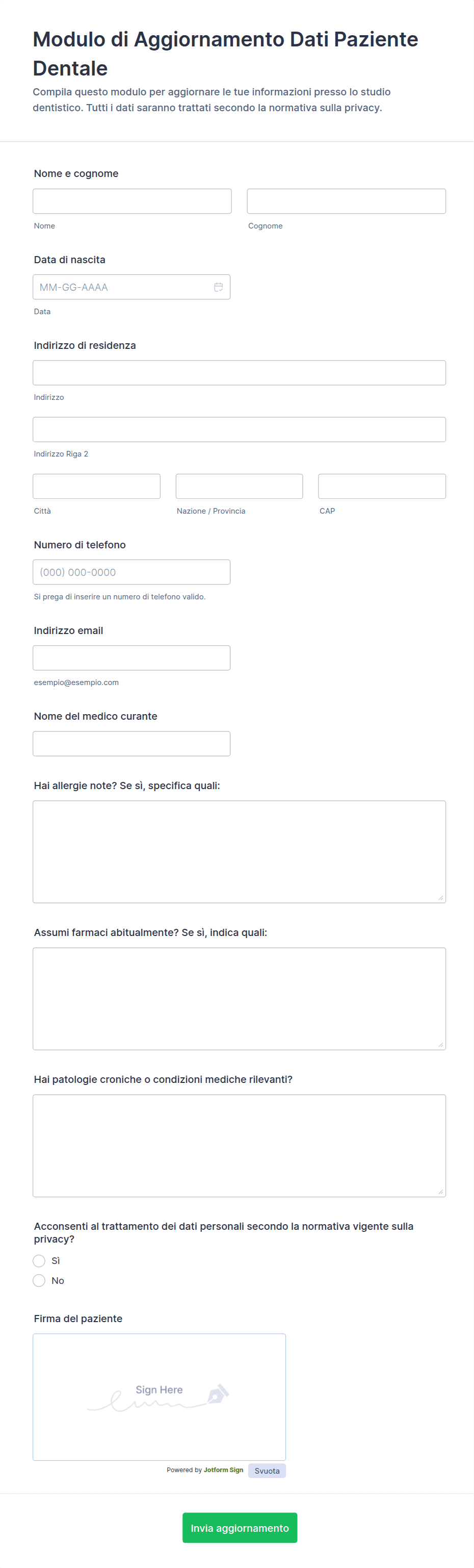 Raccogli moduli di consenso, referenze, firme elettroniche e tanto altro ancora con i moduli per dentisti ottimizzati per dispositivi mobili che funzionano perfettamente su qualsiasi dispositivo. Passando dai moduli cartacei ai moduli online, puoi raccogliere e archiviare i tuoi dati in un database online sicuro per il tuo studio dentistico, aiutandoti a mantenere le informazioni organizzate, lasciandoti al tempo stesso più tempo da dedicare ai tuoi pazienti. Inizia scegliendo un modulo qui sotto, da personalizzare con il nostro generatore di moduli, senza scrivere neanche una linea di codice, quindi trascina e rilascia gli elementi, carica il logo della tua attività, scegli nuovi colori, aggiungi un'immagine di sfondo e aggiungi oltre 100 integrazioni gratuite per sincronizzare automaticamente le risposte con gli altri tuoi account. Puoi quindi pubblicare il modulo e condividere il link o incorporarlo direttamente nel tuo sito web. Fai fare un salto di qualità al tuo studio dentistico, con i Moduli online per dentisti di Jotform.