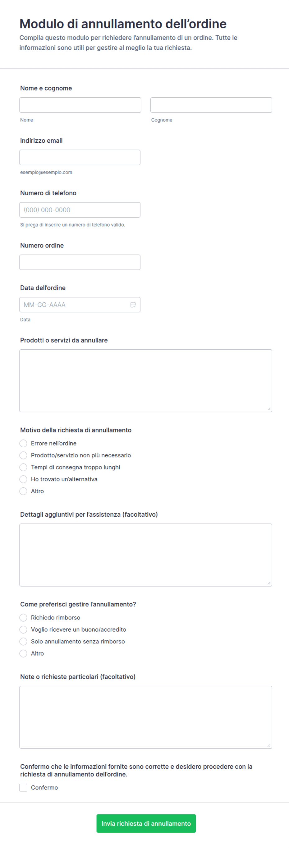 - Il contenuto e i campi variano in base al caso d'uso: ad esempio, per annullare un abbonamento in palestra potrebbero essere richiesti i dettagli del conto e un feedback, mentre per annullare un evento potrebbero essere necessari il numero di prenotazione e le preferenze di rimborso.