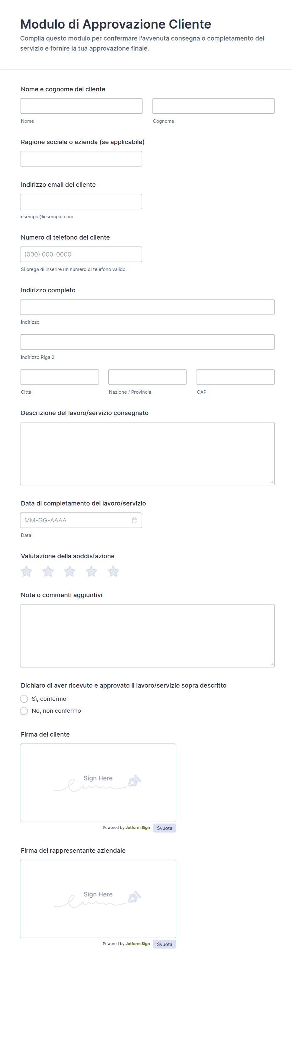 I Modelli di Modulo di Approvazione sono moduli online specializzati progettati per semplificare e automatizzare il processo di richiesta, revisione e concessione di approvazioni per una vasta gamma di esigenze aziendali e organizzative. Questi modelli sono comunemente utilizzati per richieste di ferie, ordini di acquisto, rimborsi spese, proposte di progetti, approvazioni di documenti e altro ancora. Fornendo un flusso di lavoro strutturato, i moduli di approvazione garantiscono che le richieste siano indirizzate ai decisori appropriati, tracciate in modo efficiente e documentate per conformità e trasparenza. Che tu stia gestendo processi interni delle risorse umane, approvvigionamenti o gestione di progetti, i moduli di approvazione aiutano a standardizzare e accelerare il processo decisionale.