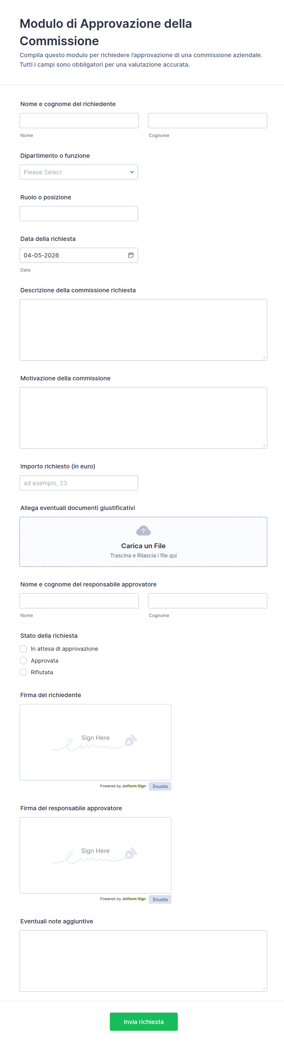 Campi comuni includono dettagli del richiedente, descrizione della richiesta, documentazione di supporto, date, e codici di bilancio o di progetto pertinenti. I campi esatti dipendono dal tipo di approvazione richiesta.