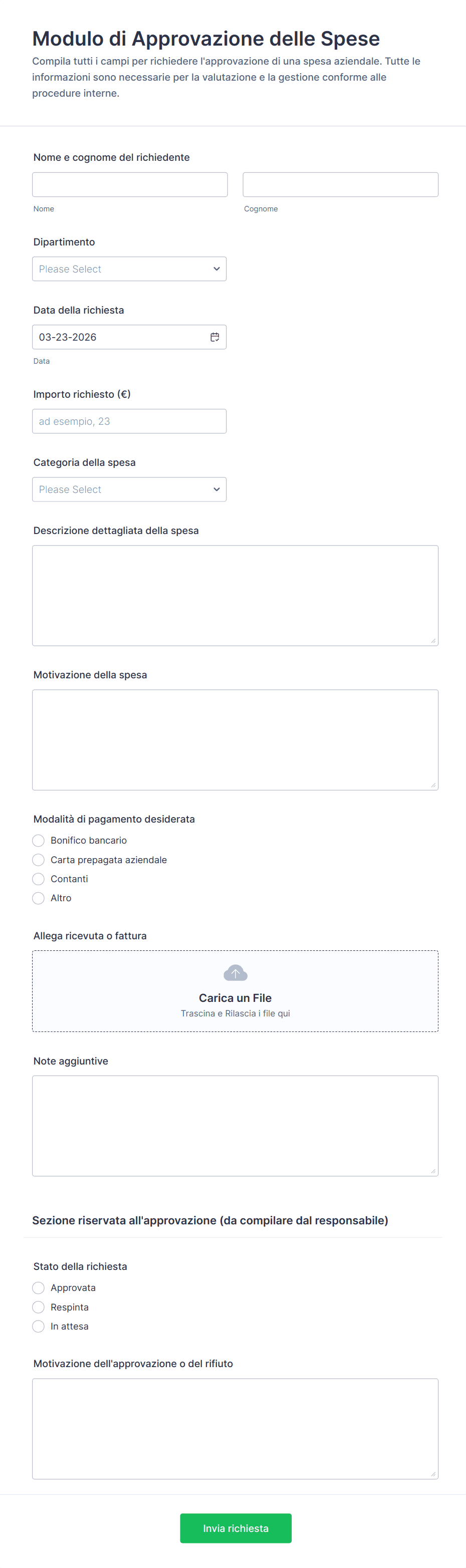 - Logica Condizionale: I moduli possono visualizzare o nascondere campi in base all'input dell'utente (ad esempio, documentazione aggiuntiva per acquisti di alto valore).