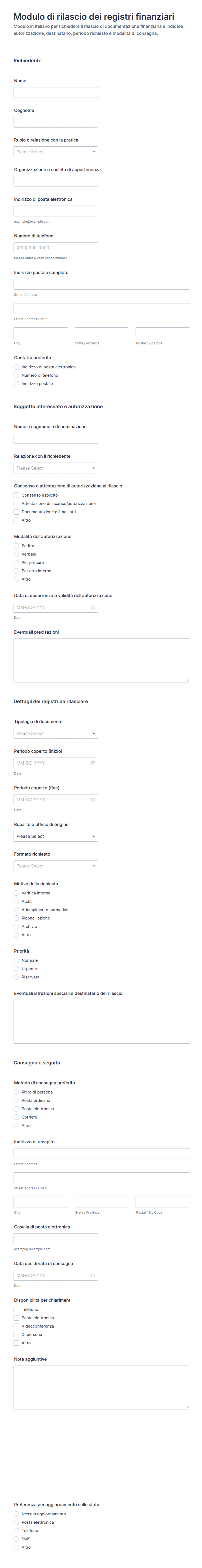 Raccogli e gestisci deleghe in modo ordinato con il Modulo di Delega, ideale per uffici, studi professionali e associazioni che devono autorizzare incarichi, ritiri o attività per conto terzi tramite Jotform.