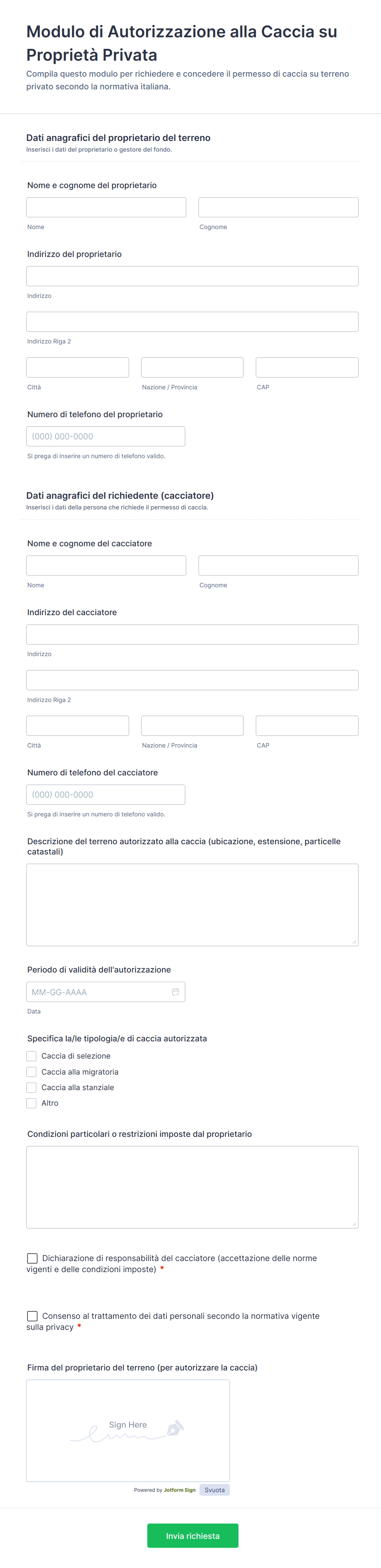 I campi comuni includono il nome e i dettagli di contatto di chi autorizza, una descrizione dell'azione da autorizzare, la durata del consenso e una firma o un riconoscimento digitale.