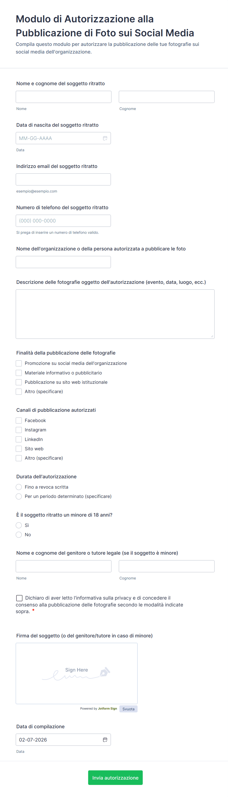 In sintesi, adattare il tuo Modulo di Autorizzazione per le Foto allo specifico scenario assicura di raccogliere le informazioni corrette e di mantenere la conformità alle leggi sulla privacy e alle politiche organizzative.