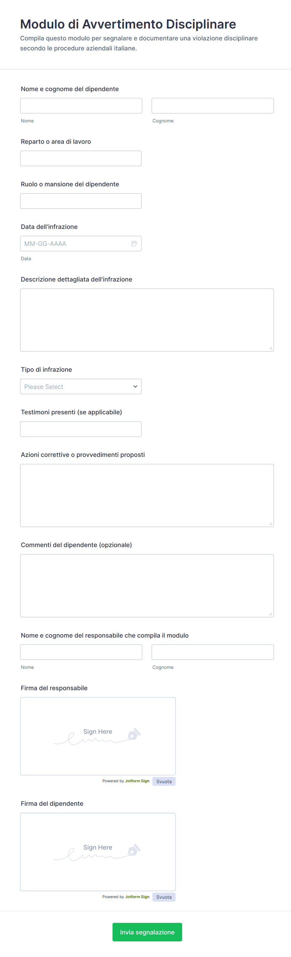 I moduli disciplinari vengono utilizzati dai datori di lavoro o dai dipartimenti delle risorse umane per segnalare reclami, avvertimenti o azioni disciplinari. Utilizzando i modelli di moduli già pronti di Jotform, la tua azienda passerà dai disordinati moduli cartacei ai potenti moduli online che possono essere compilati su qualsiasi dispositivo e archiviati in modo sicuro nel tuo account Jotform.