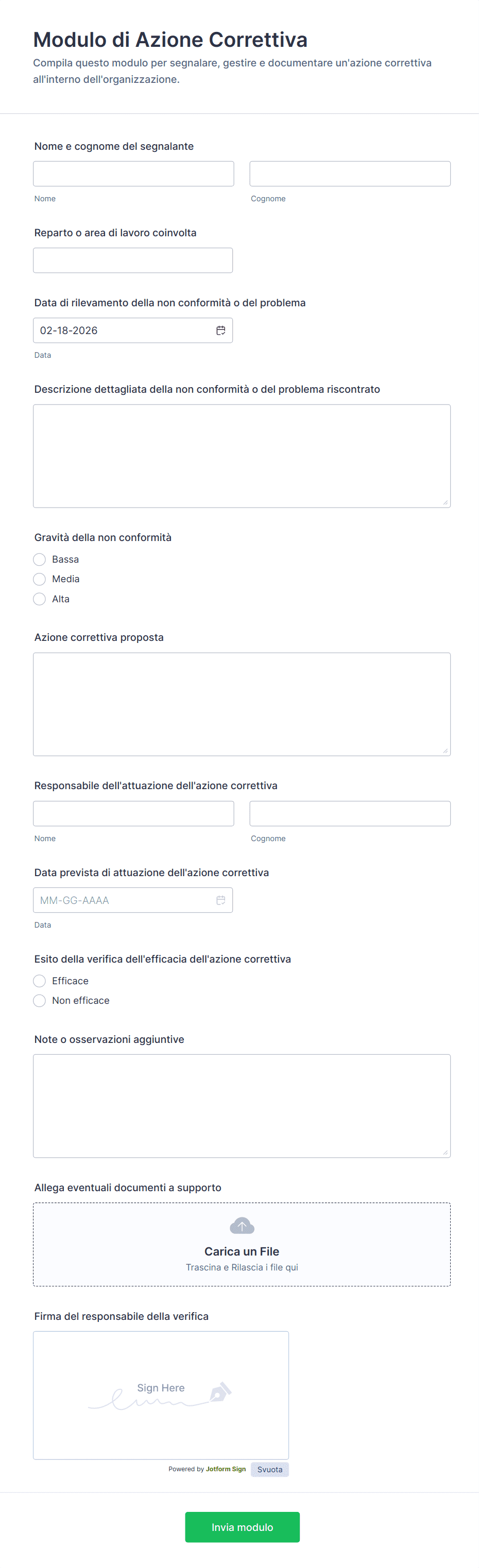 Un modulo di segnalazione incidenti è un documento strutturato utilizzato per registrare i dettagli su eventi inaspettati, incidenti o quasi incidenti in vari contesti. Aiuta le organizzazioni a documentare cosa è successo, chi è stato coinvolto e quali azioni sono state intraprese.