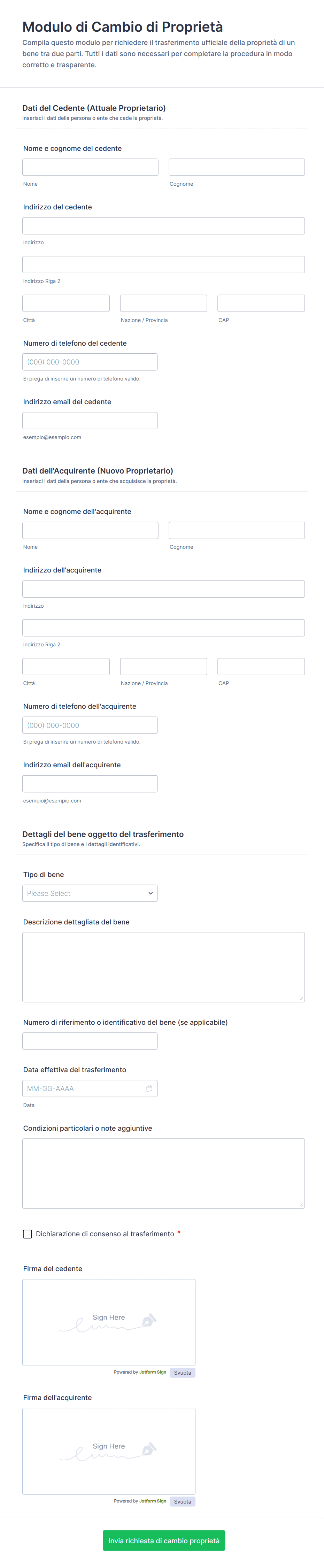 Con Jotform, gli utenti possono creare e personalizzare facilmente Moduli per il Monitoraggio degli Asset per adattarsi ai loro requisiti specifici, indipendentemente dal settore o dal tipo di asset. Sfruttando il generatore di moduli Jotform, con l'intuitiva interfaccia trascina e rilascia, gli utenti possono aggiungere campi per ID degli asset, numeri di serie, ubicazioni, personale responsabile e altro, senza bisogno di scrivere codice. Le capacità di integrazione di Jotform permettono una raccolta dati continua, notifiche in tempo reale e archiviazione automatica nelle Tabelle Jotform, rendendo semplice l'organizzazione, la ricerca e l'analisi dei dati degli asset. Che tu sia una piccola impresa, una scuola o una grande azienda, i Moduli Jotform per il Monitoraggio degli Asset offrono una soluzione flessibile e senza codice per semplificare i tuoi flussi di lavoro di gestione degli asset.