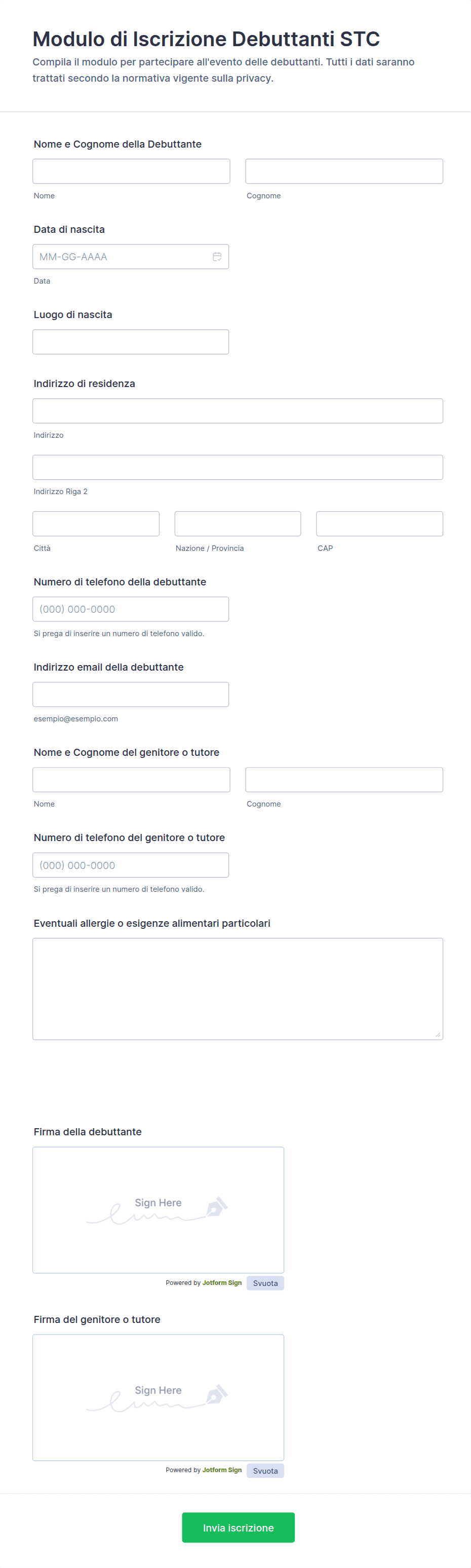 - Conferenze e seminari: raccogli i dettagli dei partecipanti, le preferenze delle sessioni e le informazioni sui pagamenti.