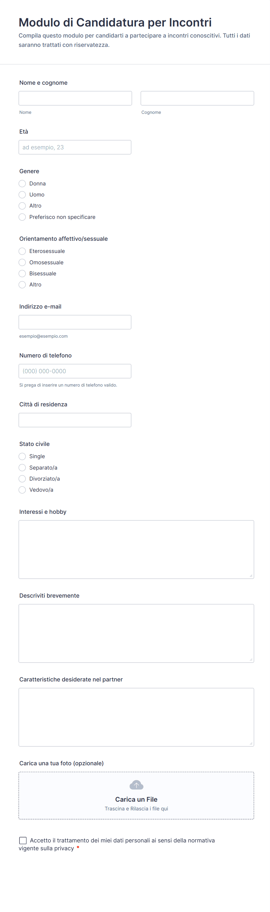 I moduli di domanda sono strumenti essenziali utilizzati per raccogliere informazioni da individui o organizzazioni che desiderano presentare domanda per qualcosa, che si tratti di un lavoro, una borsa di studio, un'iscrizione, un prestito o la partecipazione a un evento o programma. Questi moduli standardizzano il processo di ammissione, garantendo che tutti i candidati forniscano i dettagli necessari per una valutazione equa ed efficiente. I moduli di domanda possono essere personalizzati per un'ampia gamma di scenari, dalle opportunità di lavoro e volontariato alle ammissioni scolastiche, alle richieste di sovvenzioni, i contratti di locazione e altro ancora. La loro versatilità li rende indispensabili per aziende, istituti scolastici, organizzazioni non profit ed enti governativi.
