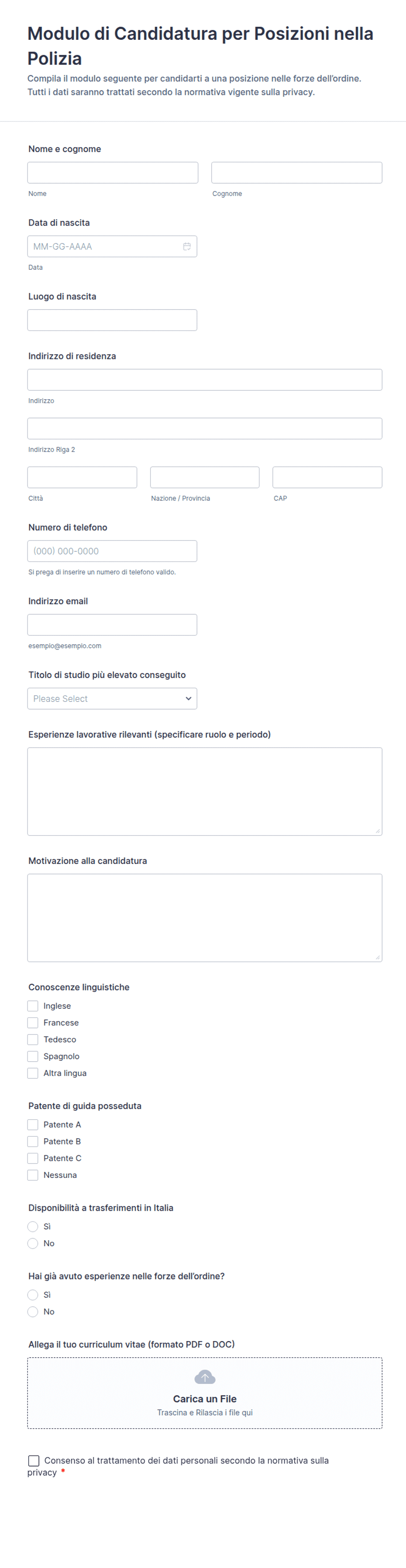 Un modulo per le forze dell'ordine è un documento digitale o cartaceo utilizzato dal personale delle forze dell'ordine per registrare informazioni relative a incidenti, pattugliamenti, attrezzature, reclami e altre attività operative.