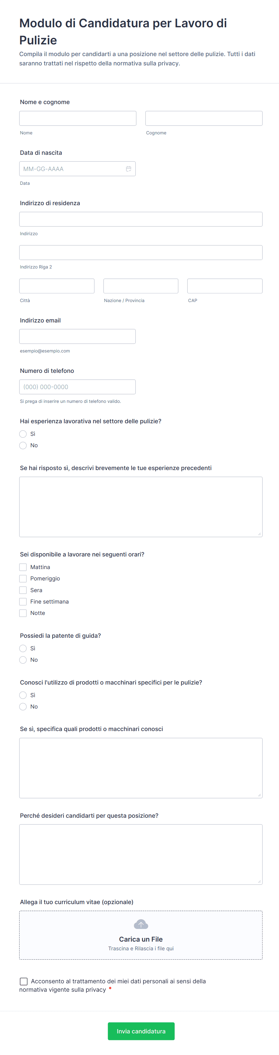 I moduli di domanda di lavoro sono strumenti essenziali utilizzati dalle organizzazioni per raccogliere informazioni standardizzate dai candidati in cerca di lavoro. Questi moduli semplificano il processo di assunzione raccogliendo informazioni chiave come dati personali, storia lavorativa, istruzione, competenze e referenze in modo organizzato. I moduli di domanda di lavoro possono essere personalizzati per una varietà di ruoli e settori, dalle posizioni entry-level a quelle dirigenziali, e sono comunemente utilizzati da dipartimenti delle risorse umane, agenzie per il lavoro e reclutatori per selezionare e valutare efficacemente i candidati. Che si tratti di posizioni a tempo pieno, part-time, stage o da remoto, i moduli di candidatura contribuiscono a garantire che tutte le informazioni necessarie vengano raccolte per una valutazione equa ed efficace dei candidati.