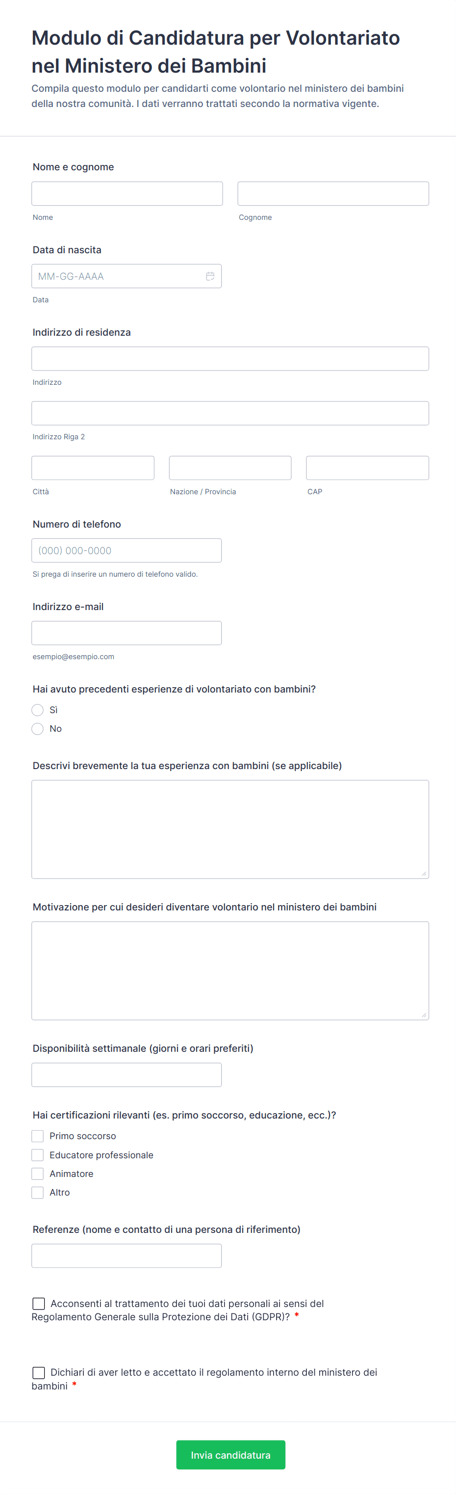I campi comuni includono nome, informazioni di contatto, disponibilità, aree di interesse, competenze, esperienze precedenti, contatti di emergenza e consenso per verifiche dei precedenti o approvazione dei genitori, se richiesto.