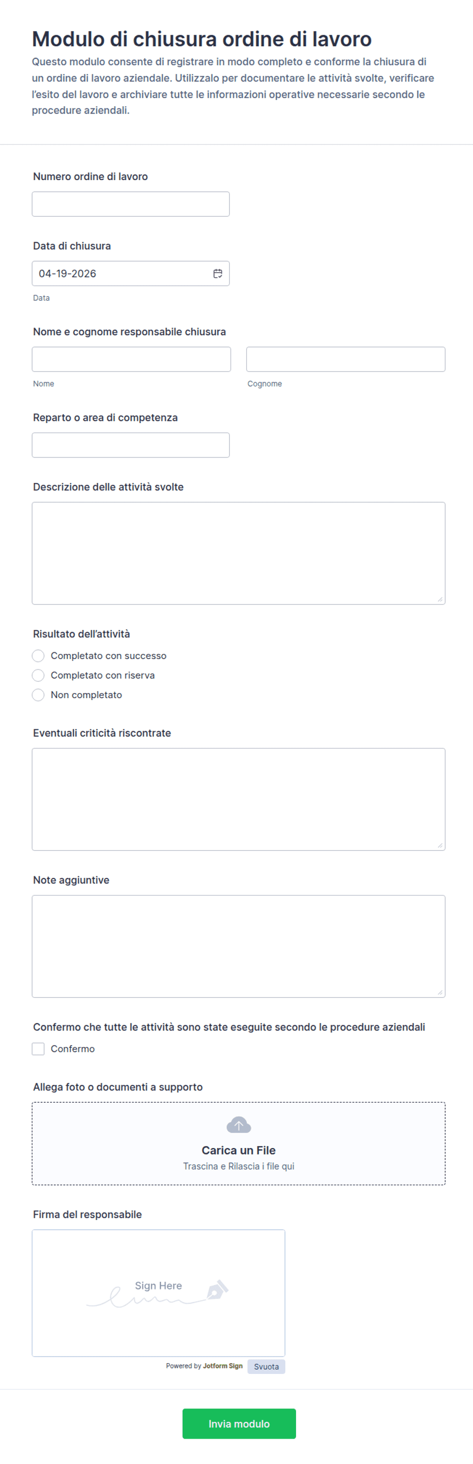 Con Jotform, creare e gestire i moduli di richiesta di intervento è facile e veloce. Sfruttando il Generatore di Moduli senza codice, con l'intuitiva interfaccia trascina e rilascia, gli utenti possono progettare rapidamente moduli personalizzati sui flussi di lavoro specifici della propria organizzazione. L'ampia libreria di modelli già pronti, i tanti widget avanzati e le potenti opzioni di integrazione di Jotform permettono agli utenti di automatizzare le notifiche, raccogliere documenti di supporto e indirizzare le richieste ai team giusti. Tutte le risposte sono salvate in modo sicuro e facilmente accessibili nelle Tabelle Jotform, per una facile consultazione, monitoraggio dei carichi di lavoro e analisi delle tendenze, per un continuo miglioramento.