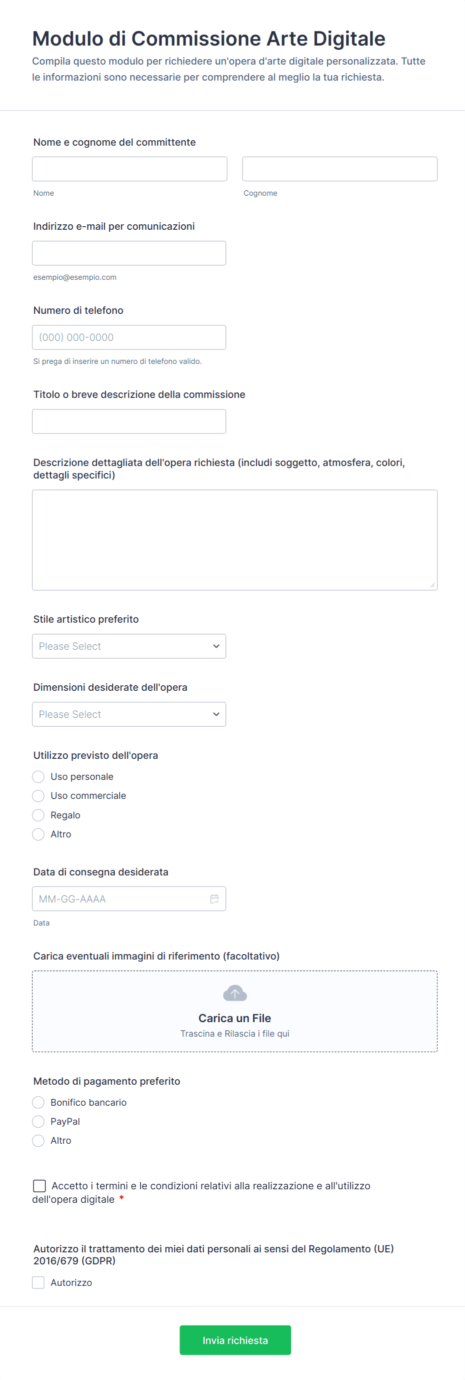 - Vendita prodotti: i moduli possono includere immagini dei prodotti, descrizioni, campi per la selezione di quantità, e integrazione dei metodi di pagamenti.
