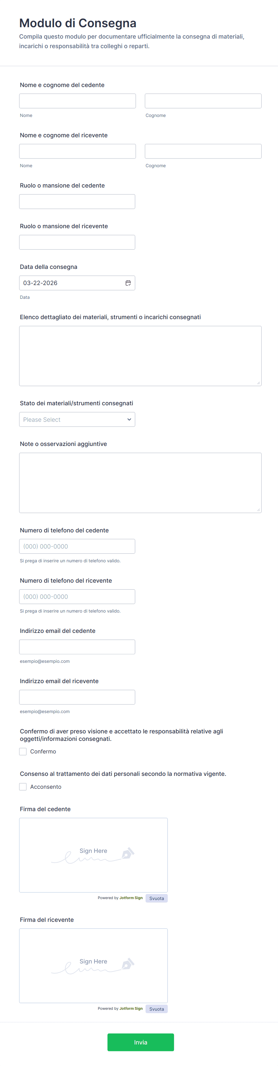 - I moduli di consegna per l'e-commerce spesso richiedono numeri d'ordine, tracking number, e campi di conferma del pagamento.