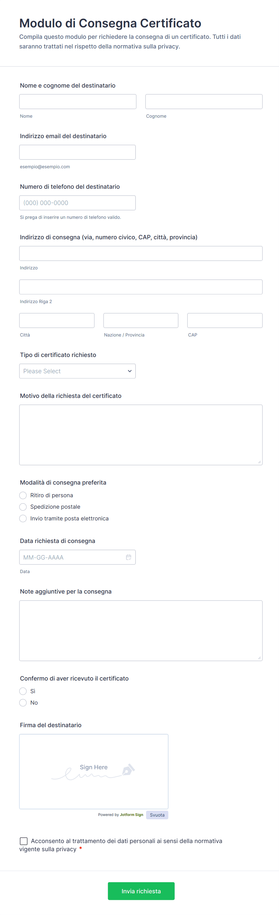 - I moduli di consegna per l'e-commerce spesso richiedono numeri d'ordine, tracking number, e campi di conferma del pagamento.