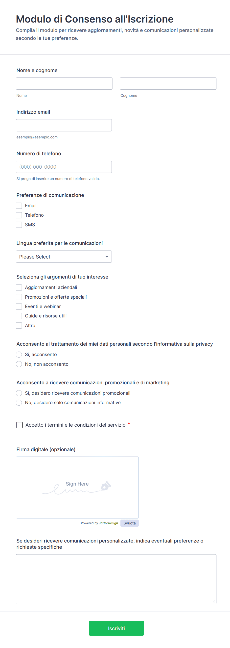 Seguendo questi passaggi, puoi creare un modulo di consenso che soddisfi i requisiti legali, protegga tutte le parti coinvolte, e semplifichi il processo di raccolta del consenso. La flessibilità e la sicurezza di Jotform, permettono di adattare facilmente il modulo a qualsiasi caso d'uso, assicurando la raccolta e la gestione del consenso in modo efficiente e professionale.