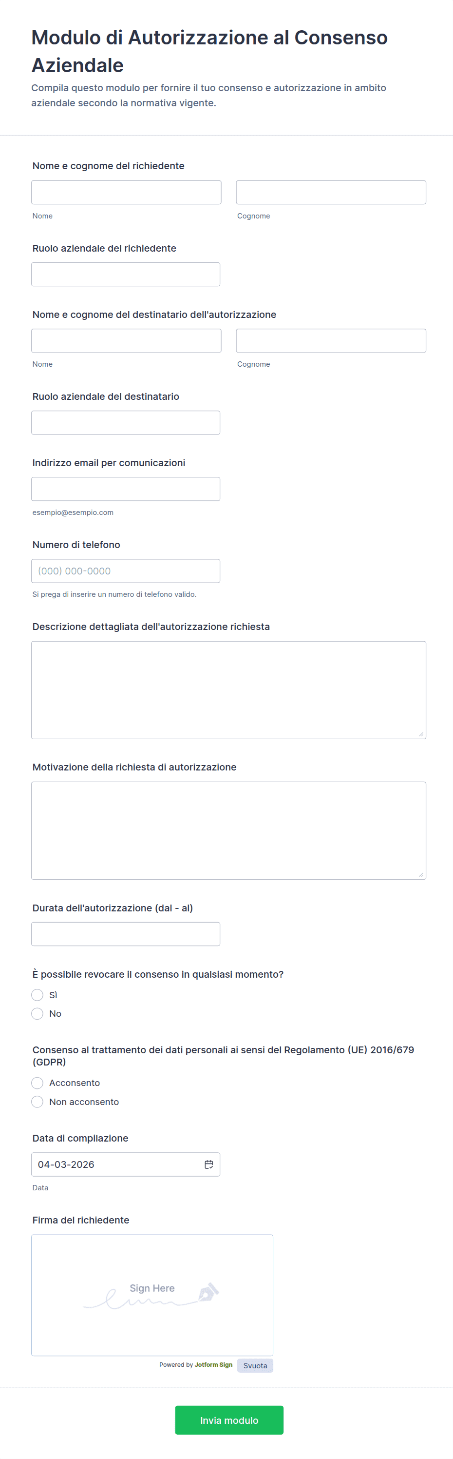 I campi comuni includono il nome e i dettagli di contatto di chi autorizza, una descrizione dell'azione da autorizzare, la durata del consenso e una firma o un riconoscimento digitale.