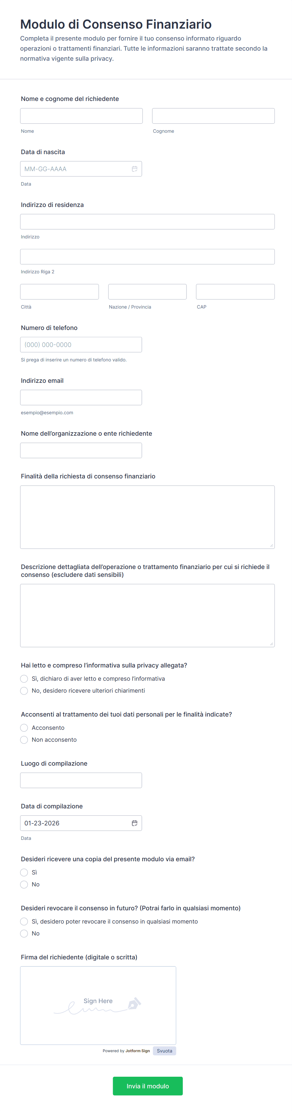 Certamente. Campi e contenuti possono essere adattati per soddisfare le esigenze specifiche di ciascuna situazione di finanziamento, garantendo che tutte le informazioni pertinenti vengano acquisite correttamente.