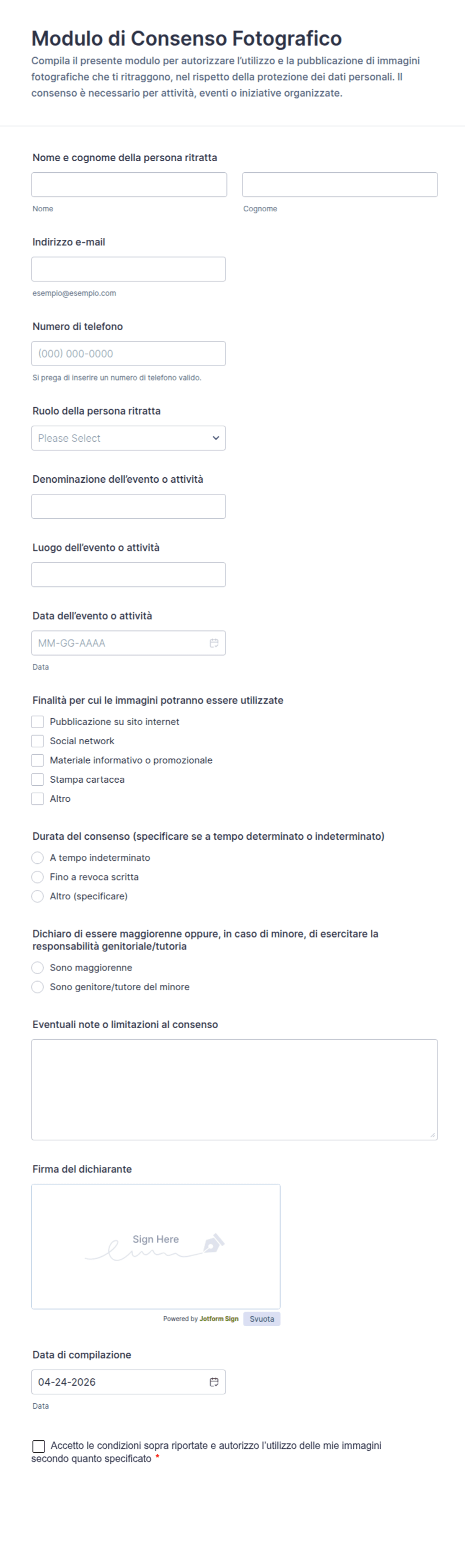 Per creare un efficace Modulo di Liberatoria Fotografica usando Jotform, segui questi passaggi: