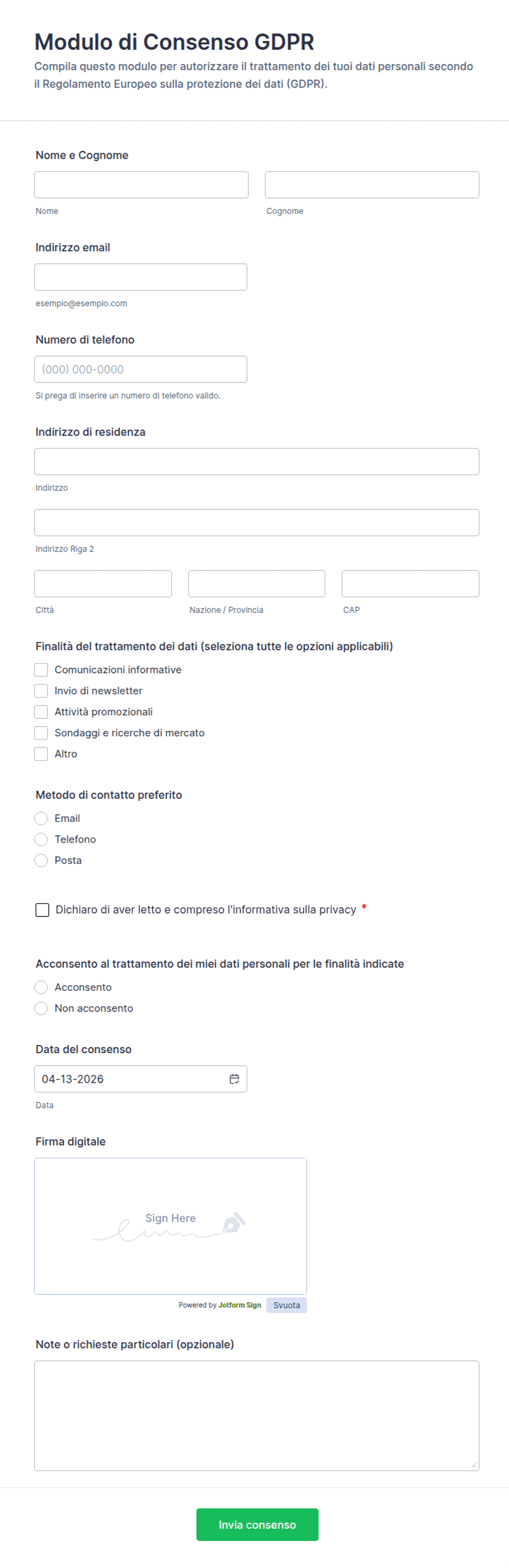 Raccogli consensi e preferenze di contatto per iscrizioni, newsletter o servizi con il Modulo di Consenso all'Iscrizione, ideale per aziende, scuole e associazioni che vogliono gestire la raccolta dati e ogni risposta in modo ordinato.