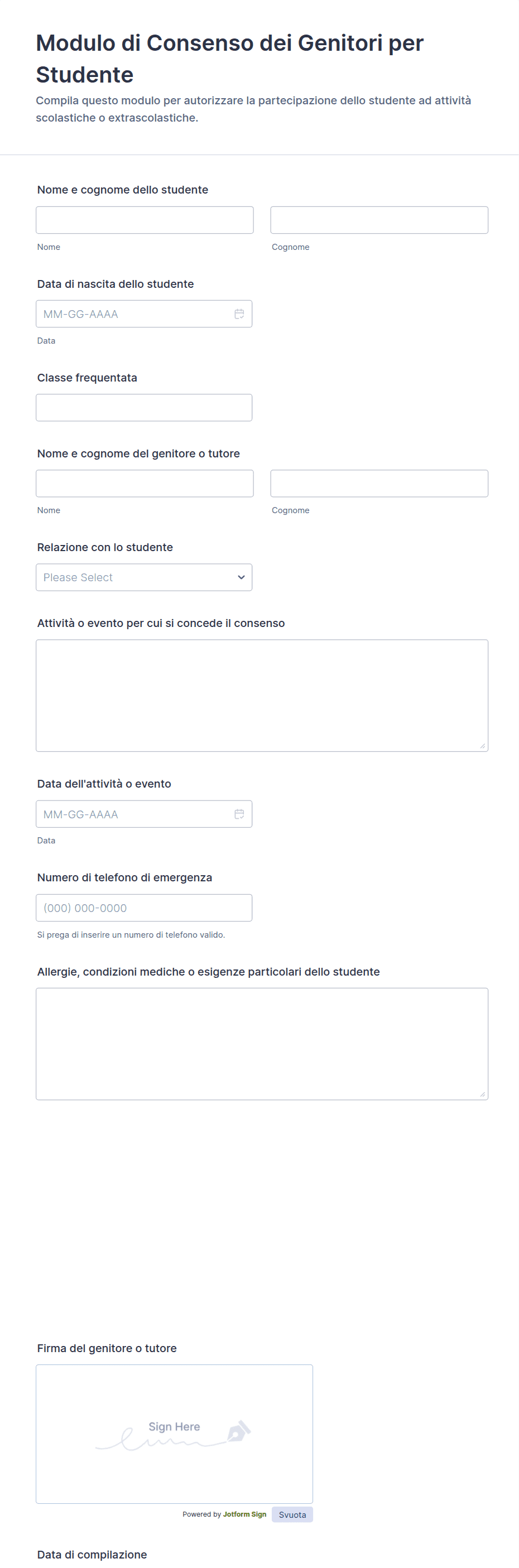 • I moduli di consenso parentale raccolgono informazioni sui bambini, dettagli del tutore e permessi specifici.