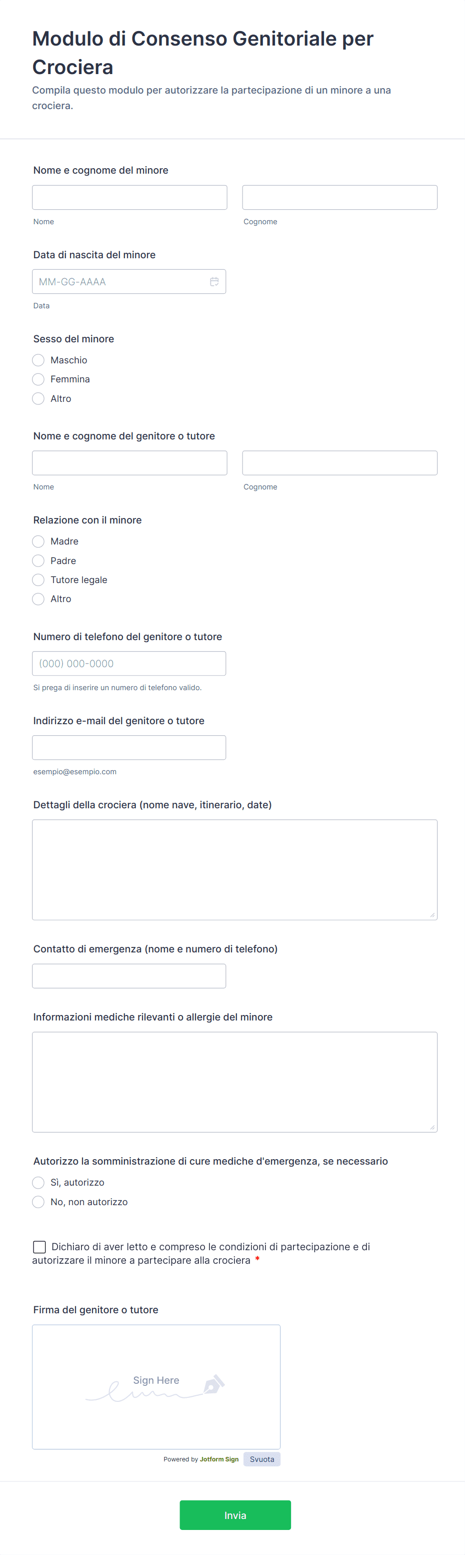 Sì, molti moduli includono sezioni per il consenso medico, permettendo agli adulti accompagnatori o organizzazioni di autorizzare il trattamento se necessario durante il viaggio.