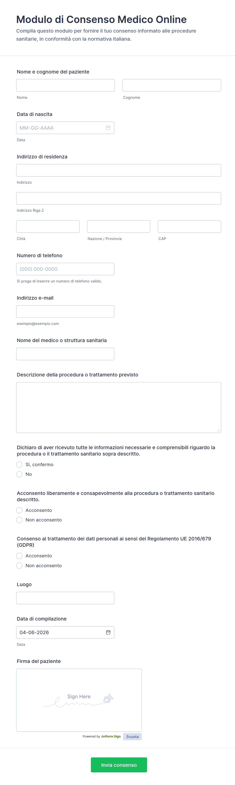 - Campi per la firma elettronica del paziente e, se necessario, del tutore o del testimone.