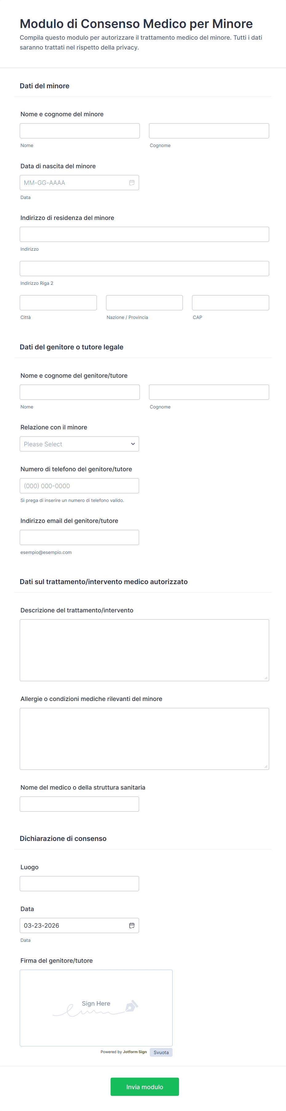 - I moduli di consenso dei genitori includono le informazioni dei tutori e possono richiedere campi aggiuntivi per i dettagli del minore.