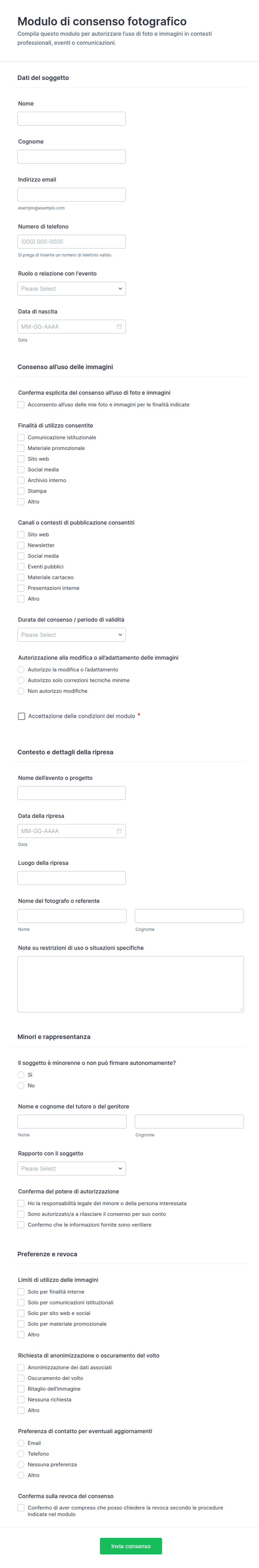 In sintesi, adattare il tuo Modulo di Autorizzazione per le Foto allo specifico scenario assicura di raccogliere le informazioni corrette e di mantenere la conformità alle leggi sulla privacy e alle politiche organizzative.