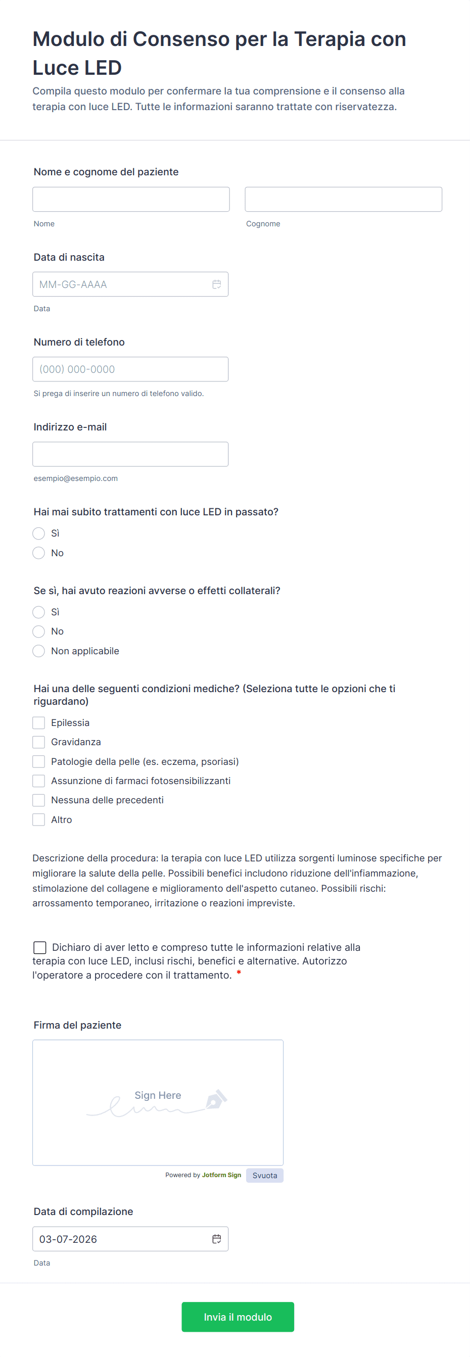 Raccogli il consenso informato per la terapia con luce LED con il Modulo di Consenso per la Terapia con Luce LED di Jotform, ideale per centri estetici e studi che vogliono gestire la raccolta dati e le risposte in modo ordinato.