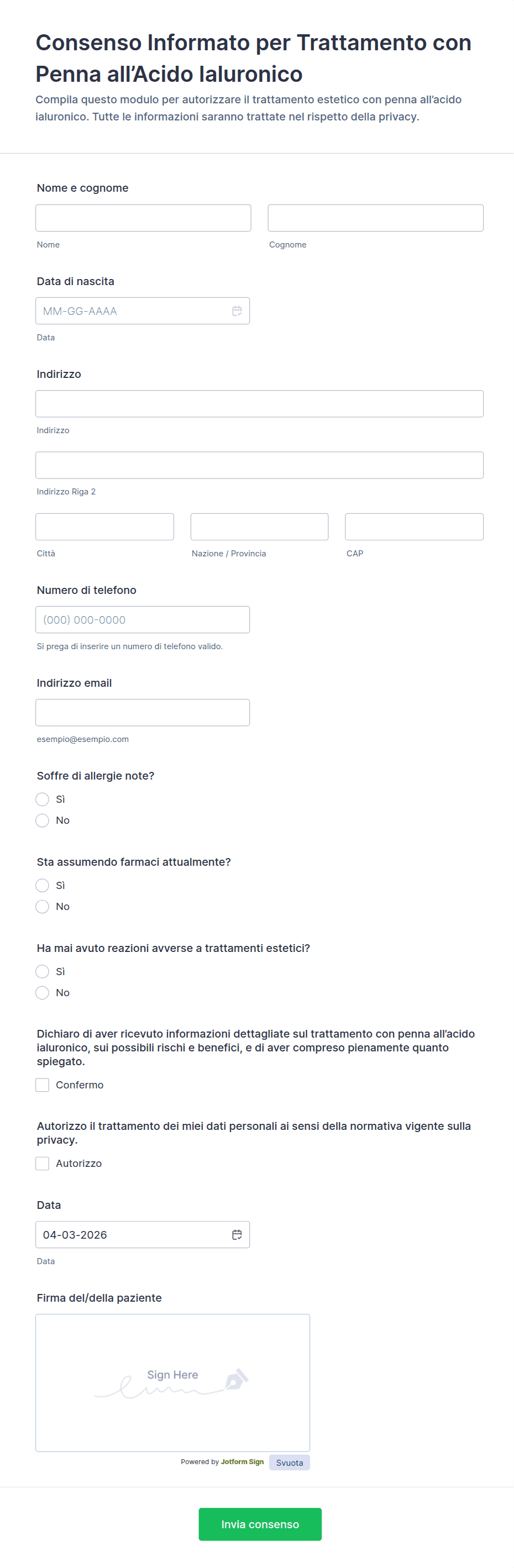 Con Jotform, creare e gestire moduli di consenso informato diventa un processo fluido ed efficiente. Il Costruttore di Moduli di Jotform, che non richiede capacità di programmazione, consente agli utenti di progettare rapidamente moduli di consenso personalizzati in base alle proprie esigenze specifiche, sia per scopi sanitari, di ricerca o aziendali. Gli utenti possono sfruttare la funzionalità trascina e rilascia, integrare widget di firma elettronica e impostare la logica condizionale per garantire l'acquisizione di tutte le informazioni necessarie. I moduli inviati vengono archiviati in modo sicuro e facilmente accessibili, garantendo la conformità e la conservazione dei documenti. L'ampia libreria di modelli e le opzioni di integrazione di Jotform semplificano ulteriormente il processo, consentendo alle organizzazioni di raccogliere, gestire e proteggere i dati relativi al consenso in modo professionale e conforme.