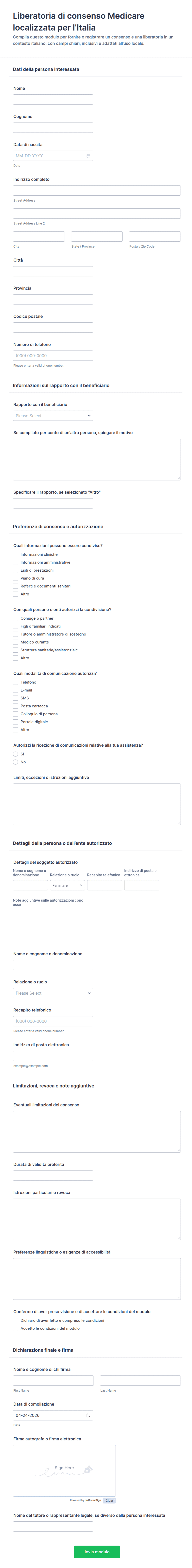 I moduli di consenso medico sono utilizzati negli ambienti sanitari per ottenere l'esplicita autorizzazione di un paziente prima di eseguire procedure mediche, trattamenti o condividere informazioni sanitarie sensibili. Questi moduli garantiscono che i pazienti siano pienamente informati sui rischi, i benefici e le alternative associate a un particolare intervento medico e che accettino volontariamente di procedere. I moduli di consenso medico sono comunemente utilizzati per interventi chirurgici, test diagnostici, vaccinazioni, consultazioni di telemedicina e il rilascio di cartelle cliniche. Svolgono un ruolo critico nel proteggere sia i pazienti che i fornitori di assistenza sanitaria documentando il consenso informato e rispettando gli standard legali ed etici.