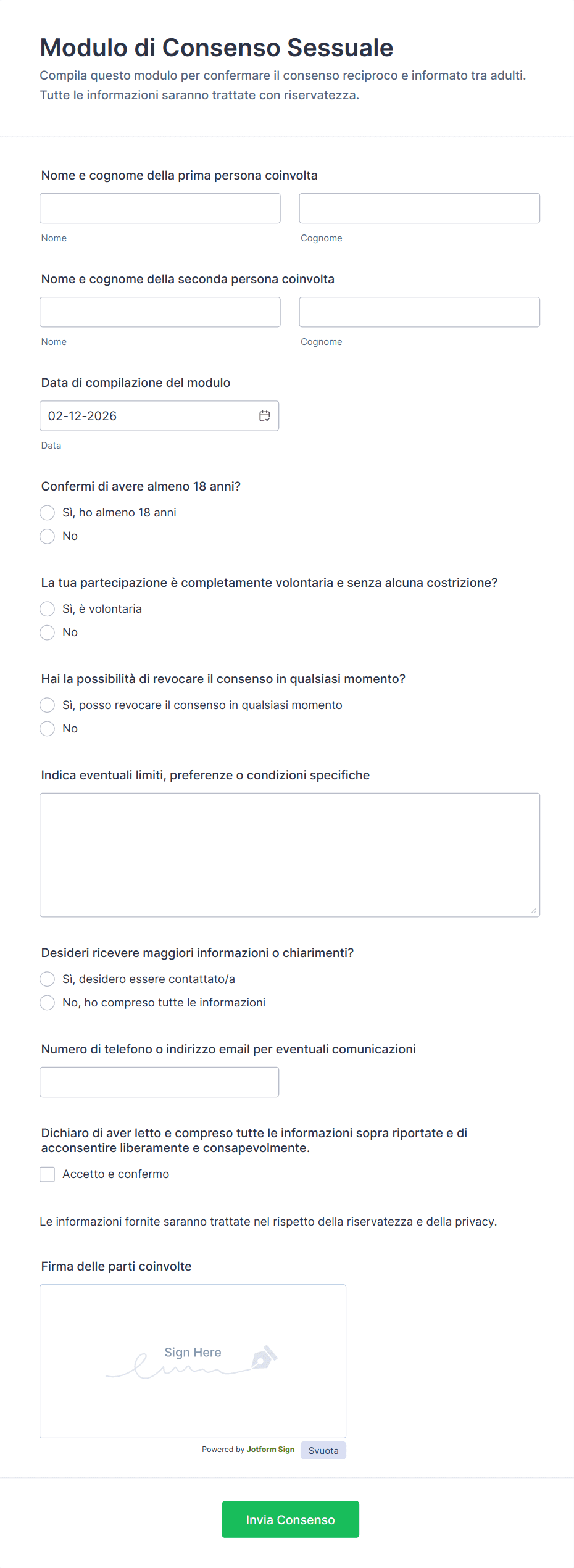 Raccogli e archivia con Jotform il consenso informato tra due persone adulte con il Modulo di Consenso Sessuale, utile per chiarire accordi e limiti in modo riservato tramite un modello di modulo pronto all’uso.