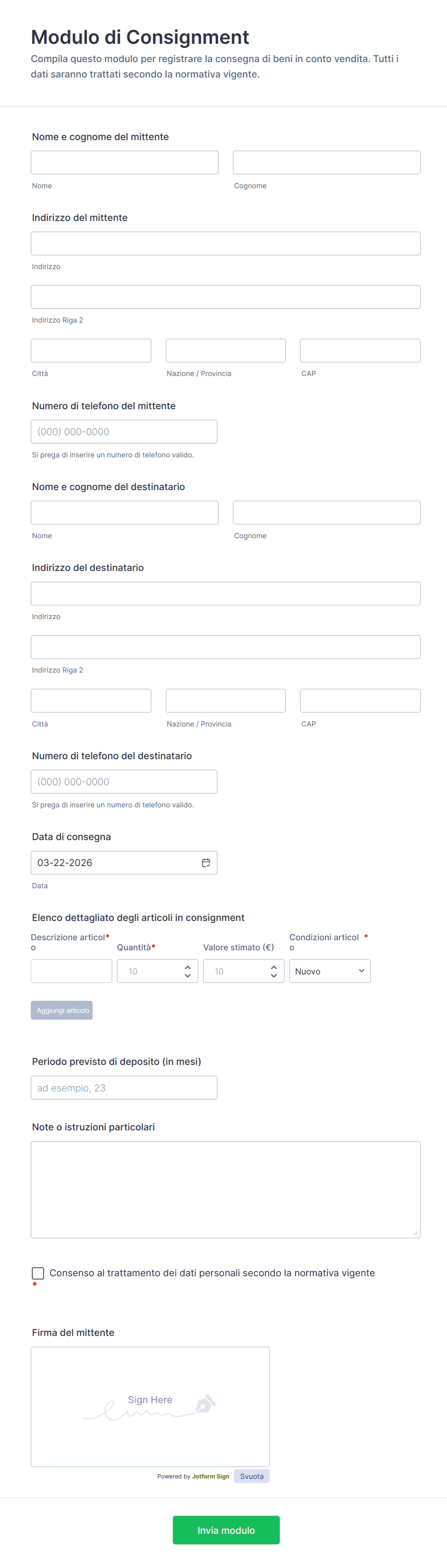 - I moduli di consegna per l'e-commerce spesso richiedono numeri d'ordine, tracking number, e campi di conferma del pagamento.