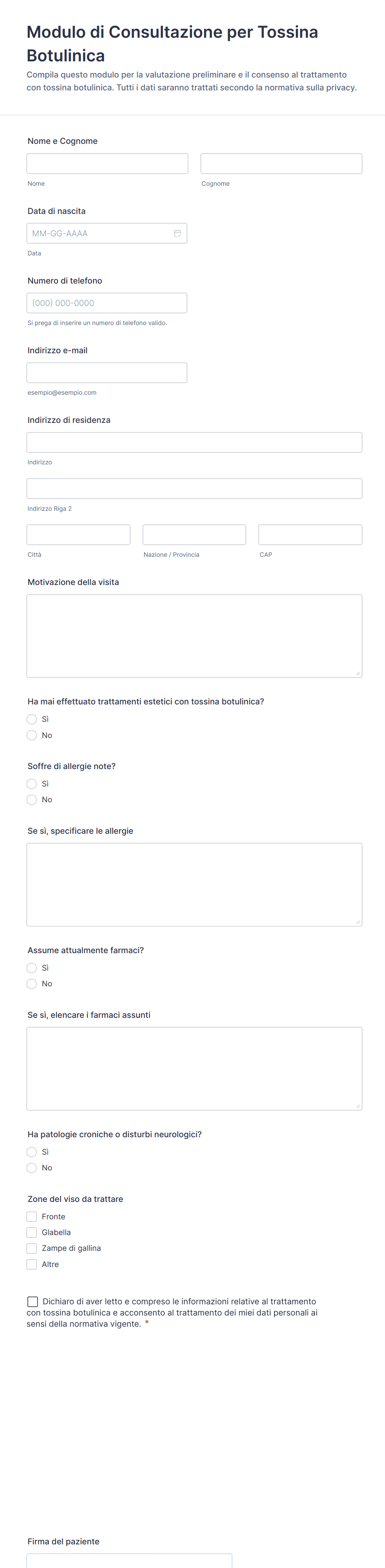 La tossina botulinica (più comunemente nota come "botox") è un farmaco cosmetico utilizzato per ridurre temporaneamente le rughe e le pieghe del viso. Se il tuo salone o clinica offre iniezioni di botox, fai registrare i clienti e programmati per i loro appuntamenti con i nostri modelli di moduli di Botox gratuiti. Seleziona semplicemente il modello già pronto più adatto alle tue esigenze, utilizza il nostro Form Builder per personalizzarlo per la tua clinica e incorporalo nel tuo sito Web o invialo direttamente ai clienti per iniziare a raccogliere le risposte.